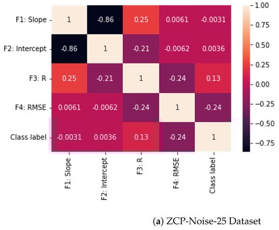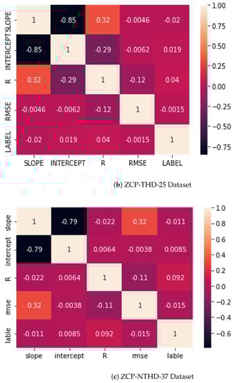 Correlation among various features like slope, intercept, correlation and RMSE in various datasets like ZCP-Noise-25, ZCP-THD-25 and ZCP-NTHD-37 is observed using correlation plots as presented in Figure 4. From the Figure 4, it is observed that there is correlation more than 50% between slope and intercept.