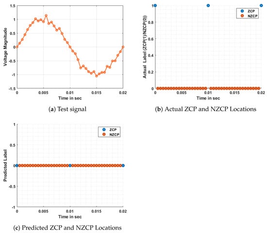 A test signal with noise level 10% and peak value of fundamental component 1V is generated in MATLAB. This test signal has total 3 zero crossing points and 48 non-zero crossing points. Feature like slope, intercept, correlation and RMSE are extracted from test signal and processed through LGR model to detect non-zero crossing points. Figure 5 shows test signal, actual non-zero crossing points and predicted non-zero crossing points. From the Figure 5, it is observed that the developed LGR model able to detect all non-zero crossing points, but unable to detect zero-crossing points.