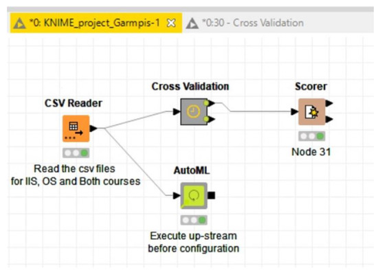 For the reasons explained above, the main components that were selected from the set of available KNIME extensions and modules included AutoML, Visualization and Reporting. KNIME makes it very simple for an analyst to train the best classification model from the available data and deploy the model to a reporting/dashboarding service (already available within KNIME and accessible via the Web browser), and it allows policy makers to visually inspect forecasts for each educational course. A part of the workflow model built for this analysis is shown in the figures below. The screenshots of CSV Reader and AutoML (Figure 2) and the Cross Validation nodes are provided below (Figure 3).