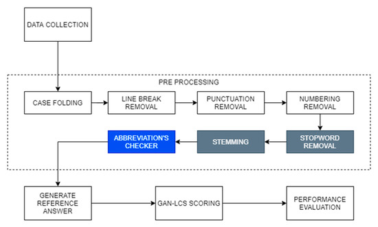 The text pre-processing step is conducted to clean the answer from unwanted characters that can distract the calculation process. In this study, we perform several stages of the pre-processing method, consisting of: