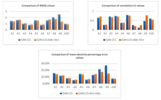 The second output compares the GAN-LCS performance and the proposed method performance through RMSE, correlation, and the MAPE value. These comparisons are represented by three graphs, as shown in Figure 3.