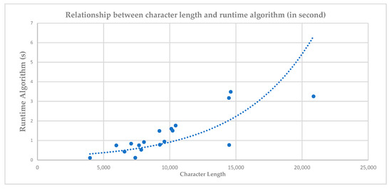 The last output is the performance evaluation of the algorithm through time complexity using Big O Notation. There are two outputs in this performance evaluation, the first is the comparison of character length and time consumption between GAN-LCS and the proposed method after the stemming process, stopword, and abbreviations checker is added, as shown in Table 6. The second is a graph, as shown in Figure 4, that illustrates the comparison of total character length and total algorithm time execution.