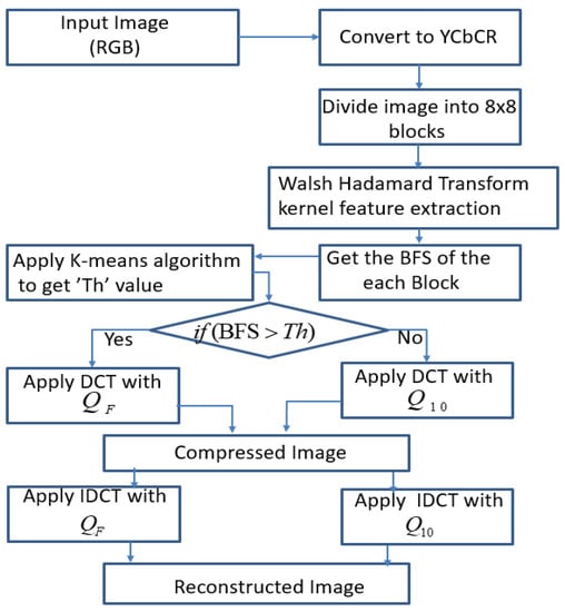 In this section, we describe the details of the proposed algorithm. Literature review revealed that the YCbCr model provides a better quality of image and it catches more human-eye-sensitive intensity colors. Therefore, it is preferably used in JPEG compression. Moreover, the RGB model is less acceptable due to its redundant nature []. As a result, we also processed the image in YCbCr color space. After conversion to the YCbCr model, the image is divided into N × N non-overlapping blocks. For each block, the block color strength, the block edge strength, and the block texture strength are extracted using Walsh–Hadamard basis [] vectors as given in (10), (12), and (13), respectively. The complete feature content of the block is generated by considering weighted combination of individual feature strengths using (15), known as block feature strength (BFS) of the block. After generation of the BFS, a block selection is made by comparing the BFS with automatically generated threshold (Th) using k-means algorithm. If the BFS exceeds the threshold value, then that particular block will be compressed by a high value of Q-Marix chosen from (17), where F ranges from 10 to 100 or else the block will be compressed by the least value of the Q-Matrix, , which offers the highest compression. In this technique, the low feature content blocks are compressed to a fixed level by , which ensures the minimum quality of the reconstructed image. To improve the quality of the reconstruction, the Q-Matrix assigned to the high BFS block should be higher than 10. For the decoding process, the respective block Q-Matrix is taken into consideration and followed by inverse-DCT process. Algorithm 1 represents the encoding process of the proposed method.