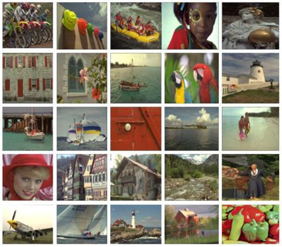 The performance of the proposed algorithm is measured based on objective and subjective evaluation criteria. The objective evaluation is made based on PSNR [] and SSIM [] at a given bpp. To evaluate the efficacy of the proposed method, we have considered seven standard images, such as Lena, Airplane, Peppers Boat, Zelda, Girl, and Couple [], in the first comparative study by using different quantization matrices, such as , and . In the second comparative study, the performance of the proposed method is evaluated for different images from KODAK dataset [] having 25 images. The different images are 24 bits color images of sizes ranging from 256 × 256 to 1024 × 1024. During simulations, we have experimented with different sets of values of , and for five images and observed that optimum performance is obtained by considering values of , and as 0.3, 0.3, and 0.4, respectively. Therefore, all simulations are made by considering this set of values only. In our experiments, we have considered only the color images. For illustration purposes, the KODAK dataset images are given in Figure 3.