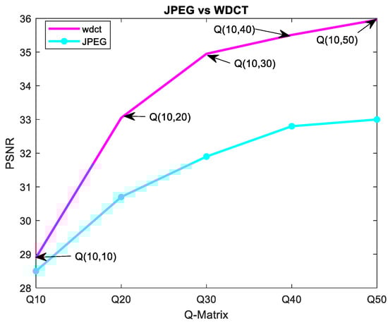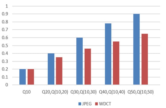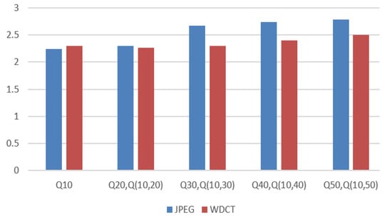 Figure 7 illustrates the comparison of the bpp values of the JPEG method and the proposed method by using a fixed QM. From Figure 8, it can be observed that, for a QM of Q10, the proposed WDCT and the JPEG method has equal bpp. However, with the increase in the quality factor of the QM, there is an increase in the bpp for both the methods. For higher value of the QM, the proposed method has lower bpp than the corresponding JPEG counterpart that ensured higher compression rate for the proposed method.