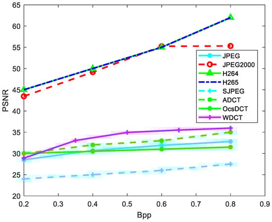 Variation in the quantization matrix controls the degree of compression resulting in variation in compression ratio and bpp of the image and, hence, the PSNR of the image. The variation in the PSNR with respect to bpp for JPEG [], JPEG2000 [], H264 [], H265 [], and AMBTC [] are shown in Figure 5. It is observed from Figure 5 that, for a fixed bpp, the proposed WDCT method has a better PSNR than JPEG [], ADCT [], SJPEG [], and, OcsDCT []. Again, PSNR comparisons for different DCT-based methods, such as ADCT [], SJPEG [] and OcsDCT [], at constant QM of Q30 are shown in Table 1. In the ADCT [] method, block-wise adaptive scanning technique was used to generate the compressed image, and the adaptive scanning improved the bpp and PSNR values. In the saliency-based SJPEG [], a saliency-based compression framework is proposed where the salient blocks are encoded separately and the non-salient region blocks are encoded individually, which ensured improved quality of the image at lower bpp. In OcsDCT [], the BAT algorithm was used to optimize the cost function to compute the threshold partially, which reduced the numberless significant DCT coefficients having lesser energy. In this way, it managed to reduce the bit rate with a higher PSNR value. From Figure 5, we can observe that our proposed method, as well as JPEG, ADCT, OcsDCT, and SPJEG are not as good as H264, H265, and JPEG2000. However, our method has the lowest complexity. The comparison of execution times will be shown in a later section.