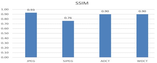 It is observed from Figure 6 that the proposed method has an SSIM value similar to that of ADCT and has an SSIM value 0.03 units less than that of the JPEG method at constant bpp of 0.6, whereas the proposed method leads in SSIM value by 0.14 units compared to the SJPEG method.