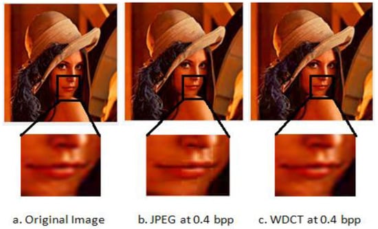 The subjective evaluation of the proposed WDCT and other DCT-based approaches are made based on the perceptual quality of the reconstructed image. Figure 10 shows the reconstructed image of Lena of size 256 × 256 by using the proposed WDCT method and JPEG at 0.4 bpp. The WDCT-based reconstructed image has a PSNR of 34.8 dB, and the JPEG-based reconstructed image has a PSNR of 31.5 dB. For the proposed WDCT approach, the main feature-containing blocks are compressed by using the , and the remaining blocks are compressed by using the fixed QM of , while JPEG is compressed by using a QM of . The variation in QM for the illustration of the two reconstruction approaches are just to maintain constant bpp. It is observed from Figure 10 that the proposed method has fewer artifacts at 0.4 bpp than the direct JPEG method at 0.4 bpp. The high feature-containing areas are compressed by using the high QM and the low feature content blocks compressed by using the low QM ensures improved bpp, while maintaining appreciable PSNR and SSIM values. The proposed WDCT method has lower bpp with better reconstruction image quality than other DCT-based approaches.