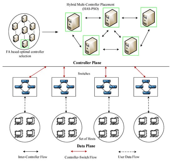 This section denotes the research methodologies of the proposed MC-SDN approach. The proposed work provides scalability, reliability, and enhances the overall network performance by three processes, which are explained as follows. Figure 1 represents the overall system model of the proposed MC-SDN architecture with distribution mechanism and selection of controllers by FA algorithm.