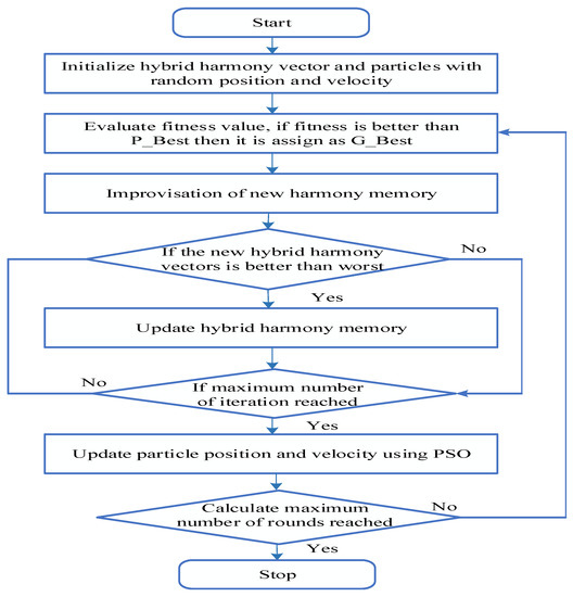 Here, the fitness function is evaluated based on location and distance B and d parameters to provide an efficient optimal solution as follows. After completed initialization, harmony improvisation is performed for generating a new harmony vector . Every new harmony vector component is generated using the following formula