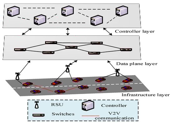 - Lin, N.; Zhao, Q.; Zhao, L.; Hawbani, A.; Liu, L.; Min, G. A novel cost-effective controller placement scheme for software-defined vehicular networks. IEEE Internet Things J. 2021, 8, 14080–14093. [Google Scholar] [CrossRef]