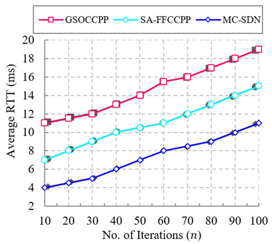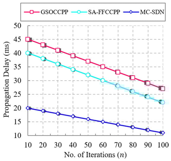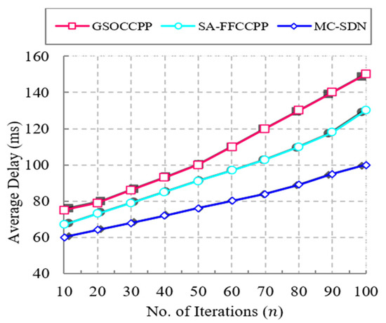 The comparison of the proposed MC-SDN method with several state-of-the-art works in terms of average delay with respect to the number of iterations is shown in Figure 9. A network with low average delay achieves a high packet delivery ratio. Average delay increases with respect to the increase of iterations. In the proposed MC-SDN method, low average delay is achieved by using the hybrid optimization algorithm, which consists of the HSA and PSO algorithms, and provides better results for placement of controllers, which reduces the average delay, whereas the previous methods perform controller placement by using a single optimization algorithm, which reduces the precision of controller placement and reduces the average delay. The results show that the proposed MC-SDN method achieves low average delay when compared with previous works. The proposed MC-SDN method has an average delay of about 100 ms, which is 30 ms faster than the SA-FFCCPP method and 60 ms faster than the GSOCCPP method. The average delay graphical changes of the proposed MC-SDN and other approaches are described in Table 10.