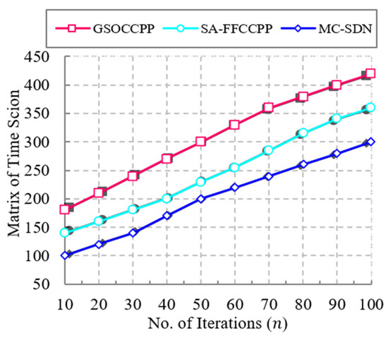 Figure 8 shows the comparative analysis of the matrix of time session between the proposed MC-SDN approach to several existing works for the number of iterations. A network with low matrix of time session achieves better transmission efficiency. In the previous works, controller placement was performed by considering the shortest distance between the switches and controllers. However, the lack of considering the controllers’ optimal increases the time for every session. In addition, a single controller also leads to high matrix of time session. To overcome these issues, optimal controller is selected in the network based on packet features using the FA algorithm, which reduces the matrix of time session efficiently when compared with existing works. From the figure, it proves that the proposed MC-SDN method achieves low matrix of time session in the range of about 300 for 100 number of iterations, which is 60 greater than SA-FFCCPP and 120 greater than GSOCCPP methods. The graphical variations of matrix of TS between the proposed MC-SDN method and the state-of-the-art works are illustrated in Table 9.