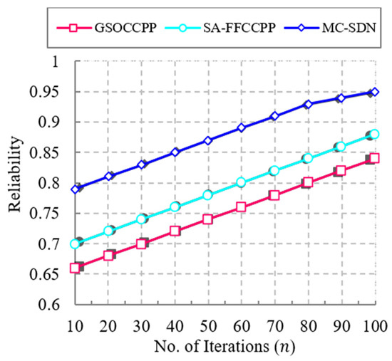 Figure 10 illustrates the comparison of the proposed MC-SDN method and several previous works in terms of reliability to the number of iterations. Increasing the number of iterations increases the reliability. In the existing methods, controller placement was performed with poorly tuned optimization algorithms and inefficient communication between controller to controller in the SDN network, which reduces the reliability of the network. In the proposed MC-SDN method, these problems are addressed, and performed efficiently tuned hybrid algorithms for placing the controllers and optimal selection of controllers to perform efficient communication between controller to controller, which increases the reliability when compared with state-of-the-art approaches. From the figure, it is clearly shown that the proposed MC-SDN method achieves high reliability when compared with other previous works. The proposed MC-SDN method attains a reliability of about 0.95 for 100 iterations, which are 0.07 greater than the SA-FFCCPP method and 0.11 greater than the GSOCCPP method for the same number of iterations. Table 11 describes the reliability variations of the proposed MC-SDN method and several existing works.