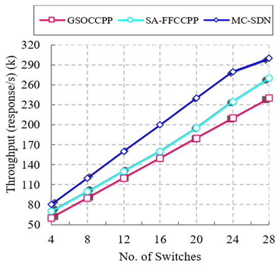 Figure 11 represents the comparison of throughput between several previous methods and the proposed MC-SDN method in terms of number of switches in the network. A network with high throughput attains a high packet delivery rate. The figure shows that the throughput increased by increasing the number of switches. The comparative results show that the proposed MC-SDN method achieves high throughput when compared with previous approaches. In the existing methods, controller placement was performed by considering some constraints like communication latency, propagation delay, etc. However, lack of considering the fault-tolerant rate reduces the throughput of the network. In the proposed MC-SDN method, optimal controller selection is performed using the FA algorithm by considering numerous packet features that provide a high fault tolerance rate, which increases the throughput when compared with state-of-the-art works. From the figure, it is proved that the proposed MC-SDN method achieves high throughput of about 300 k response/s, which is 30 k response/s higher than the SA-FFCCPP approach and 60 k response/s higher than the GSOCCPP approach. The throughput variations between the proposed MC-SDN method and other existing methods are described in Table 12.