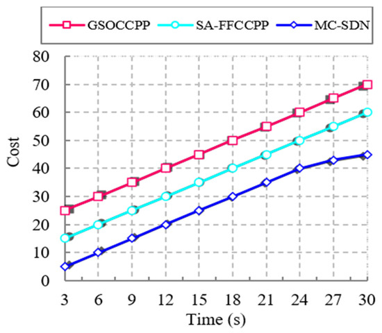 This metric is used to determine the cost of the entire network based on time. A network with low cost that achieves all the necessities provides efficient Quality of Service (QoS). Figure 12 illustrates the comparison of cost with respect to time for the proposed MC-SDN method and several previous approaches. The graph shows that the cost increases with increasing time. In the previous methods, controller-to-controller communication was not efficiently performed, which is more time consuming and increases the cost.