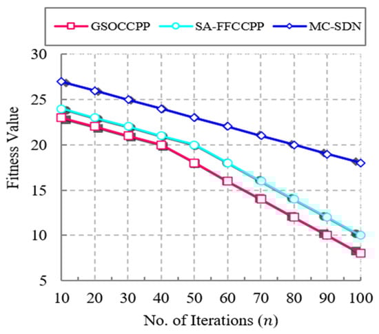 This metric is one of the important metrics used to analyze the fitness value of the proposed MC-SDN method. Fitness value is calculated by evaluating the optimal solution for the controller placement problem for analyzing the solutions’ goodness (i.e., fitness) to the problem. An optimization with a high fitness value provides an efficient optimal solution. Figure 13 illustrates the comparison of fitness value between the previous approaches and the proposed MC-SDN method in terms of number of iterations. The graph clearly shows that the fitness value decreases when the number of iterations increases. In the SA-FFCCPP method, the authors used a simulated annealing optimization algorithm and in the GSOCCPP method the authors implemented the garter snake optimization algorithm for providing solutions to controller placement. However, the fitness value of these algorithms does not fit the controller placement problem efficiently due to poor adaptation mechanisms and accuracy.