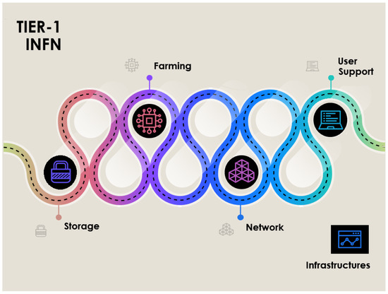 - dell’Agnello, L.; Boccali, T.; Cesini, D.; Chiarelli, L.; Chierici, A.; Dal Pra, S.; Girolamo, D.; Falabella, A.; Fattibene, E.; Maron, G.; et al. INFN Tier–1: A distributed site. EPJ Web Conf. 2019, 214, 8002. [Google Scholar] [CrossRef][Green Version]