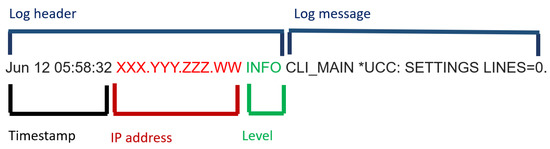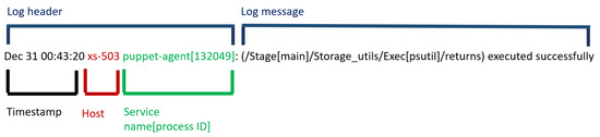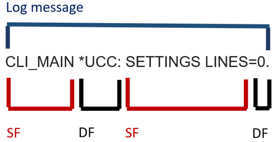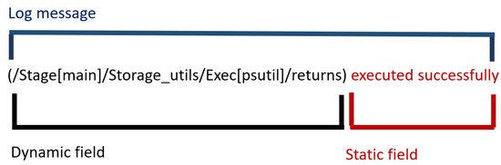 Figure 4 and Figure 5 show two examples of the log message of a log entry, characterized by a natural-language text whose interpretation is difficult because there is not an official standard defining the message format. The text is usually composed of different fields called dynamic and static: a dynamic field is a string or a set of strings that are assigned at run time; a static field does not change during events. Such fields can be delimited by different separators, such as a comma, a white space or a parenthesis. Logging practice is scarcely well documented.