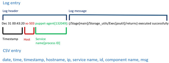 During the data preprocessing we have first changed the format of log files, which have turned into .csv files by applying service-specific procedure, because we have had to take into consideration different log header structures (as shown in Figure 2 and Figure 3), one per service. This procedure is able to manage each entry of the log file, performing at least the following operations: adding e.g., either internet protocol (ip) address or hostname when they are missing, service name when it is missing; splitting service name and process identifier (id); and getting component name. When the log file is turned into .csv format, the entry in the .csv file contains the log message (msg) and a set of other variables (see Figure 7 for a graphical representation), such as: date, time, timestamp, hostname, ip address, service name, id, component name. The hostname and ip couples are not always both available, especially when the service runs on a virtual machine. Each file is related to a particular service that runs on a well-known machine in the data center. Its location is obtained by a local database and included into the resulting file.