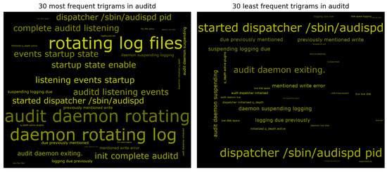 Furthermore, representing the most frequent and least frequent words via word cloud can be useful for bringing out anomalous patterns in the case of large log files, especially rare words. Figure 8 shows two word cloud of the first (and last) thirty subsequences of length 3 from audit log messages sequences [25]. For example, in the wordcloud in Figure 8 the anomalous “suspending logging“ pattern appears among the less frequent tri-grams. Analyzing the list of the various n-grams, we have seen that some messages containing “suspending logging“ continue with “due previously mentioned write error“. Consequently, in addition to “suspending logging“, “previously mentioned write error“ has also been added to the dictionary. This will be essential to add information and to track anomalies in order to create groups of different types of anomalies.