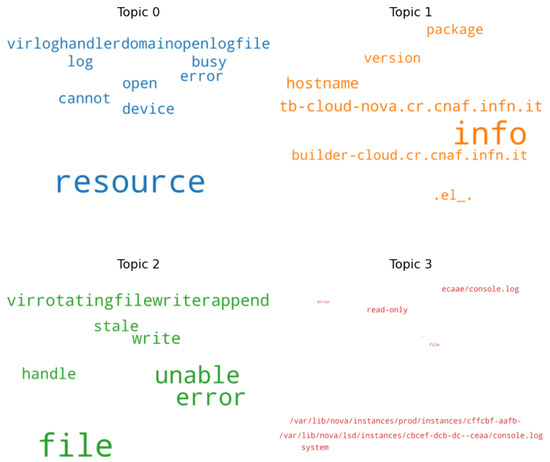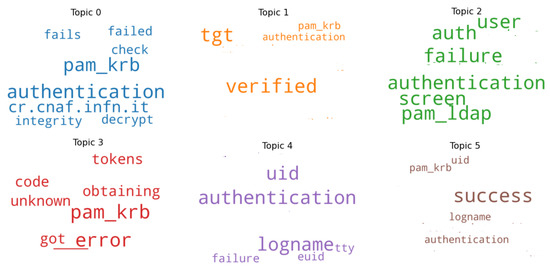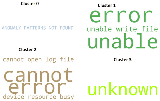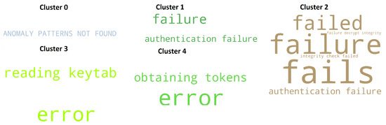 Each row of the feature matrix corresponds to a different log message. From how the feature matrix was built, each message is associated with a row vector, which contains count values. Consequently, starting from the feature matrix, those messages that had equal row vectors were grouped. An ad hoc clustering algorithm was built that would group log entries that had equal rows in the feature matrix. Lines that contain null values mean that no anomalous patterns have been found for that particular log message. These messages were grouped in ‘Cluster 0’. Each cluster, excluding the Cluster 0, constitutes an anomalous message prototype common to one or more log entries. Figure 11 and Figure 12 show key terms, included in the dictionary, which constitute such prototypes for the screen and virtlogd services.