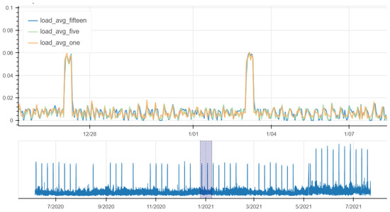 Figure 13 shows load average metrics at 1 min, 5 min and 15 min for a certain machine over time. The trends of the three metrics are very similar. The grey rectangle in the bottom plot is zoomed in the top plot. The plot on the top shows load average values below : they are between 0 and except the end of December 2020 and the end of March 2021 where we observe an increase of due to the usage of core in the machine. However, the measured values for these three metrics do not concern us.