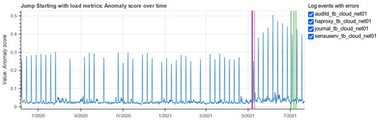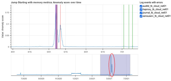 Concerning the monitoring data, we have applied the JumpStarter solution [3], a multivariate time series anomaly detection based on compressed sensing to determine anomaly score and use it to label observations. This methodology is also completely unsupervised and calculates the anomaly score for each time instance, by comparing the original time series with the one reconstructed by the model. JumpStarter requires an input data matrix that has the metrics as columns and the instants in time in which the values were recorded by row. Since our monitoring observations were all recorded every hour of the analyzed period, it was not a problem to create such a matrix. Figure 14 shows the JumpStarter anomaly score resulting from memory metrics. In the same plot we have reported with vertical lines the anomalies checked in four log files for their corresponding services, such as audit, haproxy, journal and sensu-service. The plot on the top shows the anomaly score in the zoomed period where anomalies in the logs were found. The bottom plot shows the trend of the anomaly score throughout the entire analysis period. It is noted that the graph is flat almost throughout the period, except for some small variations, but that the score increases in the period in which errors occur in the logs.