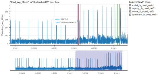 In this section, we are going to present results at machine level, combining what we have obtained during the log analysis and time series of monitoring data. We have produced a huge quantity of results, therefore we have decided to show what we consider the most suitable to explain our study. The considered machine is called tb-cloud-net01 where the audit, haproxy, journal and sensu-service services run. The analyzed period goes from 6 June 2020 up to 21 July 2021.
