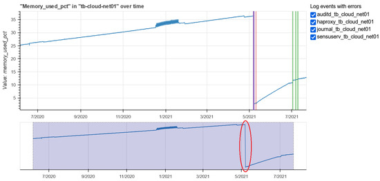 Answering to RQ3 and RQ4, not only is it possible to obtain the status of a machine by observing the monitoring metrics, but at the same time the anomalies found in the services provide additional information. Looking at the above tables with anomalies and the graph on the percentage of memory used, there is a correspondence between the occurrence of some anomalies in the logs and the sudden drop in the metric recorded in the period from 6 May 2021 to 7 May 2021. The percentage of memory used reached values below in the same period in which anomalies, such as “suspending logging due to previously mentioned write error”, “log file is not writable”,“config file does not exist or is not readable”, occurred in the services. Extremely similar results were found for other machines. For this reason we suggest to combine the information obtained from the two data sources mentioned in this article.