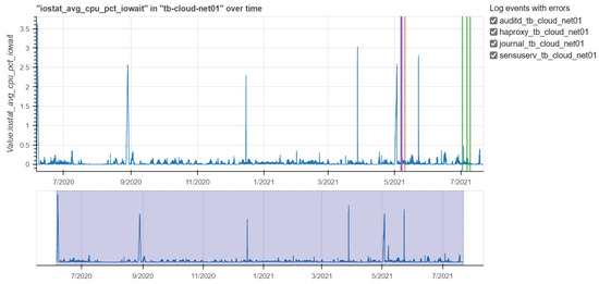 Figure 16, Figure 17 and Figure 18 show the time series of load, memory and iostat metrics respectively for the tb-cloud-net01 machine, reporting anomalies of the considered services. The colored vertical lines represent anomalies identified in the log files of the selected services. Furthermore, each figure shows a grey rectangle in the bottom plot that is zoomed in the top plot.