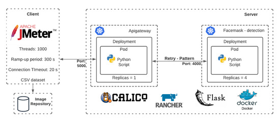 We designed three test cases to validate the fault tolerance capability of our platform. We used JMeter tool [63] to simulate users concurrently sending requests to the service. We configured Jmeter with 1000 threads (users) and a specific ramp-up period for each case. Each thread pulls an image from a 100-image repository and sends the request to the API gateway service, which is routed to the facemask service. We used JMeter to simulate users concurrently sending requests to the service. The purpose of each test case and the expected results are described below.