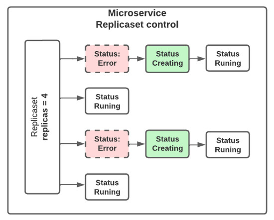Figure 3. Microservice ReplicaSet control.In the second test, we ran the experiments in the presence or absence of failures and using or not the retry pattern. In the case of failures, we injected a 20 s service interruption and got 10% of requests with errors when not using the retry pattern. We should note that the retry pattern allows us to keep the error percentage at 0 percent. However, as expected, the maximum response time increases during the failure. Table 1 shows the request response times and the percentage of error in each of the evaluated cases.