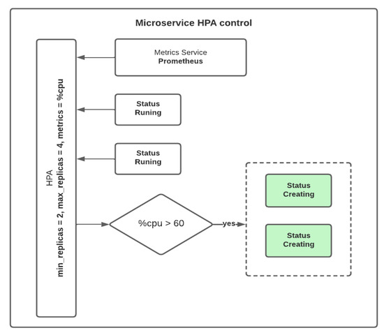 Based on the demand for a service, the system must allow for horizontal scaling (i.e., adding more service instances). Horizontal scaling can be done manually or through the use of autoscaling [52], which requires monitoring of the instances (health check) and the resources they use (i.e., CPU, memory, bandwidth) to make real-time decisions about the resources assigned to each microservice. The creation of decision-making systems for scalability can be as simple as defining rules triggered depending on readings of resource consumption, or may involve complex solutions that rely on artificial intelligence algorithms [52,53].