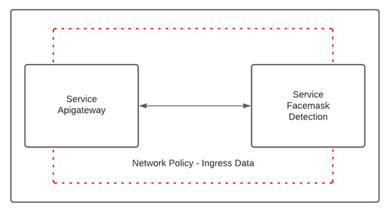 Figure 4. Microservice HPA control.For this case, we used a Jmeter ramp-up period of 2 min and set the number of replicas for the facemask deployment to two. We used the CPU utilization as the metric to scale the service to four instances. We set the maximum CPU utilization to 60% and verified that Kubernetes created the additional instances when the CPU utilization threshold is exceeded in less than 2 min while processing the 1000 requests. This traffic represents a bigger demand than expected during the rush time (1000 users in 5 min) and the platform quickly responds by autoscaling the pods. - Case 3: The ability of the system to route traffic in a controlled manner. Communication channels were established using Calico’s network policies to define routes for the most important services, such as the API gateway and facemask detection, to improve the security of data delivery between microservices. To validate this operation, we sent data in compliance with the routes defined using the network policies and observed the platform’s proper operation. When attempting to bypass a service by sending it via an incorrect path, the platform restricts the passage of information. Figure 5 shows the network policies to enter data into the platform and connect internally to the microservices. The network policies, in this case, allow the creation of a bridge between both namespaces and find the services by using their names and not the IP addresses, avoiding connectivity problems when IP addresses change. Each policy is created with a configuration file shown in Listing 1.