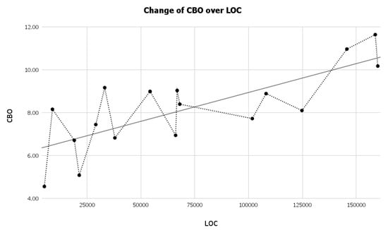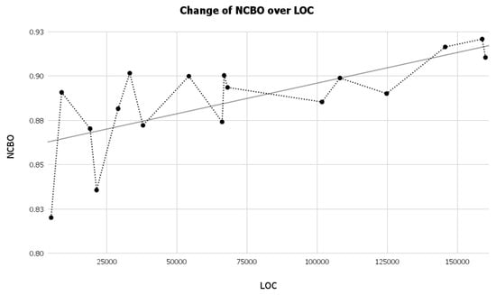 Maintainability is defined as “the ease with which a software system or component can be modified to correct faults, improve performance or other attributes, or adapt to a changed environment”—IEEE. There have been many models proposed to quantify maintainability (e.g., [,,]), but difficulties remain. For example, El Emam et al. [] found that controlling for class size invalidated previously significant studies using CKJM metrics as a means to identify fault proneness, with many of those quality metrics also used to quantify maintainability. In our study, we seek to mitigate these issues by controlling for size, and then normalizing CBO and DCBO. We normalize CBO as NCBO using the formula proposed by Okike and Osofisan [], , where is the module complexity (normalized CBO), and is the coupling complexity (CBO). We normalize DCBO as NDCBO using the same formula. We use the normalized CBO and DCBO metrics as an indicator of the system’s overall maintainability.