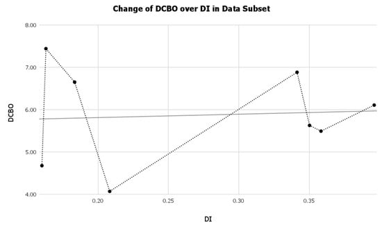 In an effort to remove LOC as a confounding variable, we take the four projects with the lowest DI proportion and the four projects with the highest DI proportion and perform Friedman statistical analysis []. Table 4 yields , indicating that there is no longer a significant change in NCBO as LOC increases in this subset of data. We use this subset of data to perform additional analysis on DI, CBO and DCBO.