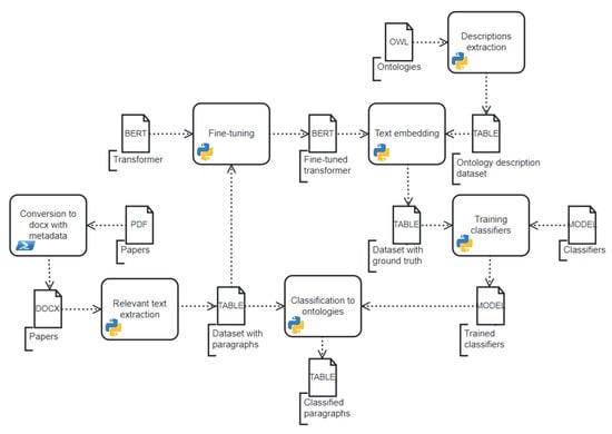 The found solution for retrieving text data from multi-column PDFs uses the engine contained in Microsoft Word. Its ability is able to pass both problems and extract the text without issues. It identifies meta-information in the content such as titles, paragraphs, and sentences. Some source documents contain irrelevant text to the topic of interest, such as references, acknowledgments, etc. The descriptions of ontologies are usually contained in Ontology Web Language (OWL) files. The OWL’s internal structure [] is a kind of XML structure for ontologies extended by RDF. Content describing classes and relationships can be marked by different tags depending on the ontology developer’s decision.