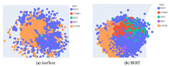 We start with representation learning of annotations using the fastText and BERT algorithms and examine the generated embeddings. For dimensionality reduction, we use the UMAP algorithm with a count of 15 neighbors, a minimum distance of 0.5, and a cosine metric. We found that with three-dimensional embeddings, much more information is preserved (and it is possible to split clusters that might be inseparable in 2D). The results are shown in Figure 3. Blue dots denote embeddings from NCIT, red dots embeddings from CHMO ontology, green dots embeddings from AFO, purple dots embeddings from SBO, and orange dots represent CHEBI ontology embeddings. Three example sentences with the annotations assigned to them by fastText and BERT are shown in Table 2. The annotation “carbon dioxide” was assigned by BERT to all three new example sentences.