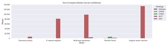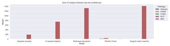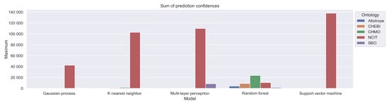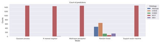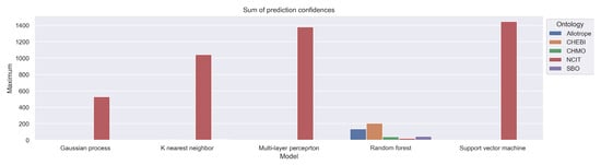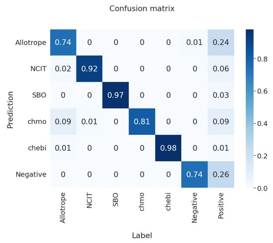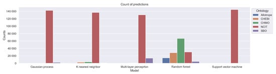 We perform our experiments using a set of five chemical domain ontologies (Table 1) developed as part of the NFDI4Cat project []. The National Cancer Institute Thesaurus (NCIT) [], Chemical Methods Ontology (CHMO) [], and Allotrope Foundation Ontology (AFO) [] ontologies are closely related to the chemical domain. Chemical Entities of Biological Interest (CHEBI) [] and Systems Biology Ontology (SBO) [], on the other hand, are expected to have a lesser connection to the chemical domain based on their names. This is not necessarily true for CHEBI, as it describes a plethora of chemical entities that are also relevant in the chemical domain, not just the biological domain. The SBO was chosen because it contains some general laboratory and computational contexts. It can also be observed as a kind of test to whether the tools used can also identify ontologies that do not match the text content.