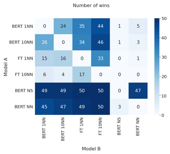 Another model, and an even more widely used model for learning representations, is the Bidirectional Encoder Representations from Transformers (BERT) []. It is usually used for data analysis tasks such as classification or clustering, where it is suitable to represent documents by embedding them in a vector space. Such a representation is usually the result of representation learning by ANNs—a deep text-processing neural network is trained towards two goals—prediction of a hidden word in a sentence and order prediction of two given sentences. In comparison to fastText, BERT embeds the entire input sentence at once, generating contextual embeddings for each token—the same token is embedded differently in different contexts. This makes it possible to achieve top results in text classification [] and named-entity recognition tasks []. Another advantage of BERT is that its transformer architecture has impressive transfer learning capabilities [], which can be useful for fine-tuning the model for tasks that fall outside the pretraining data distribution.