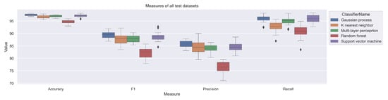 - K-Nearest Neighbors (k-NN): Neighbors-based classification stores individuals from the training dataset. A query instance is assigned to the class that has the most representatives within the point’s nearest neighbors. In nearest neighbor classification, uniform weights can be used, i.e., the value assigned to a query point is calculated by a simple majority vote of the nearest neighbors. In some cases, it is better to weigh the neighbors so that the nearest neighbors contribute more. For example, if the class of a queried point is computed from two nearest points and one of them is closer than the second by a defined metric, the resulting class in this case is the class of the closest point. The distance d between two points can be calculated as: , where n is the dimension of the space and , if , this is the Manhattan distance and in the case of , this is the Euclidean distance [].