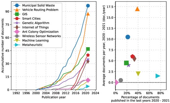 Statistics show that most population will be concentrated in cities by 2050 [], increasing the waste generation in both quantity and complexity []. The uncontrolled population growth in cities will require smarter solutions to meet the higher demand for services, which will probably find solutions through technological development. In this regard, Information and Communication Technologies (ICT) will play an important role in achieving sustainable living spaces []. Some sectors are already being renewed thanks to investments in development, such as urban transportation [] and smart buildings []. However, despite the advances in services offered for citizens in cities, fundamental sectors still need more investment to reach sustainability. Among sectors that could use more technological solutions to improve their services is the MSWMS [], in which operations are still carried out traditionally in most countries.