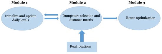 The model considers three modules operating simultaneously to determine the daily distances trucks travel to collect the waste. These modules are (i) waste level through days, (ii) dumpster selection and distance matrix generation, and (iii) route optimization. Figure 8 illustrates how the complete system operates, with arrows pointing to directions in which modules are communicating.