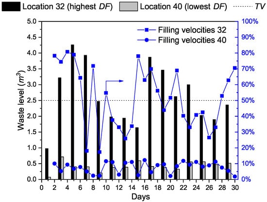 Initial levels inside dumpsters were determined using a uniform probability distribution as the initial approach. The parameter responsible for the stochastic update of daily levels was named filling velocity ( f v ), calculated based on demographic factors. This parameter is responsible for the waste level increase during the period studied since it represents the oscillation percentage in waste volume for a given dumpster. Equation (10) illustrates the mathematical equations used to determine filling velocities ( f v i , j ), daily waste level ( L i , j ), and the amount of waste ( L c i , j ) in m3 for dumpster j in day i.