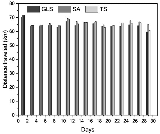 For this reason, module 3 will receive the load matrix ( L c i , j ) and the distance matrix ( D M i ) when executed. Other information needed for the execution was rather calculated based on the real operation by the company (number of trucks) or provided by the company (real capacity of trucks). The three metaheuristics are executed simultaneously to return daily distances traveled, the detailed path followed by the trucks, the loads being carried, and the execution time. The most important information is the execution time, and distance traveled since the load will be the same regardless of the algorithm. The load will be the same because the total demand will not change accordingly to the algorithm, only the path found in the decision-making in each metaheuristic. Algorithm 1 represents the whole operation performed by the 3 modules in this study.