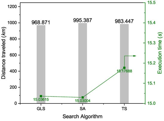 The module specified in this section is the most important in this work since this study’s main goal was to define the best algorithm available in OR-Tools for waste collection route optimization. The three metaheuristics assessed in this work for waste collection optimization in the city of Bragança were Guided Local Search (GLS), Tabu Search (TS), and Simulated Annealing (SA). This module will interact with both previously discussed ones, receiving crucial information from both to be executed. All 3 metaheuristics use the same data set as input to find the shortest path for the waste collection, considering the problem as a capacitated waste collection problem, described in more detail in Section 3. The data set includes the number of trucks ascribed to the task, the capacity of each truck, the distance matrix, and the loads in each location that should be visited.