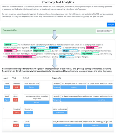 Using cutting-edge models for text categorization, pharmaceutical domain named entity recognition (NER), co-reference resolution (CRR), semantic role labeling (SRL), and knowledge extraction, we built our modular PharmKE platform [38,39]. The platform is primarily intended for human users. Pharmaceutical domain specialists may easily identify the information extracted from the input texts thanks to PharmKE’s visualization of the findings from each of the integrated models.