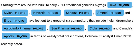 The SpaCy, AllenNLP, BERT, and BioBERT models were also trained using these datasets, and the results are given in Table 4. To better visualize the accuracy, Figure 3 denotes a sentence extracted from pharmacy-related news where the Pharmaceutical Organization entities are recognized as expected.