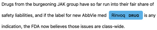 Each correctly classified pharmaceutical text was further analyzed by recognizing combined entities through the proposed models, as well as by using BioBERT for the detection of BC5CDR (https://biocreative.bioinformatics.udel.edu/tasks/biocreative-v/track-3-cdr/, accessed on 1 November 2022) and BioNLP13CG (https://github.com/cambridgeltl/MTL-Bioinformatics-2016/tree/master/data, accessed on 1 November 2022) tags [40], which include Disease, Chemical, Cell, Organ, Organism, Gene, etc. Additionally, we used a fine-tuned BioBERT model in order to detect Pharmaceutical Organizations and Drugs, entity classes that are not covered by the standard NER tasks. We explain the fine-tuning process in more detail in Section 4. Tag collisions when combining the results from both models were avoided by applying the precedence of the tags recognized by our fine-tuned model over the tags recognized by BioBERT’s model (Simple Chemical). All of the recognized entities are visualized in the sentence, along with their respective tags.